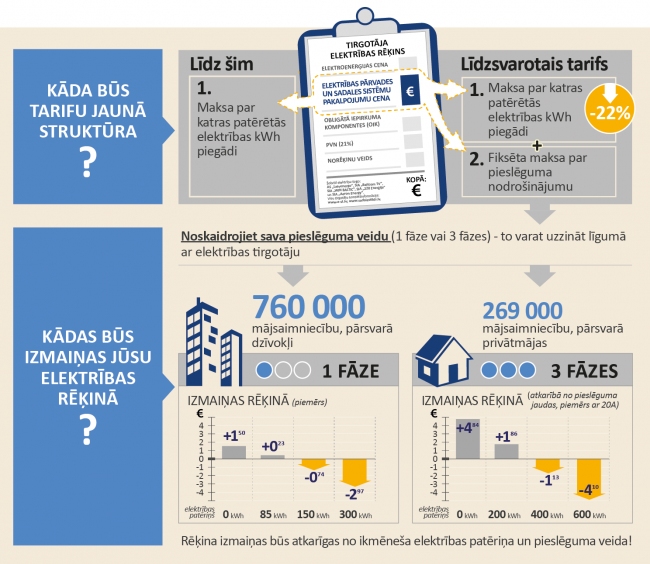Pirmos elektrības rēķinus no elektrības tirgotājiem, atbilstoši Sabiedrisko pakalpojumu regulēšanas komisijas apstiprinātajiem tarifiem, iedzīvotāji saņems septembra sākumā. Līdz šim iedzīvotāji maksāja par katras patērētās elektrības kilovatstundas piegādi, bet līdzsvarotajā tarifā iedzīvotajiem līdzšinējā pakalpojuma cena par elektrības piegādi veidosies no 2 daļām: fiksētas ikmēneša maksas par pieslēguma nodrošināšanu un maksas par elektrības piegādi atbilstoši patērētajām kilovatstundām, kas līdzsvarotajā tarifā ir samazināta par līdz pat 22%.