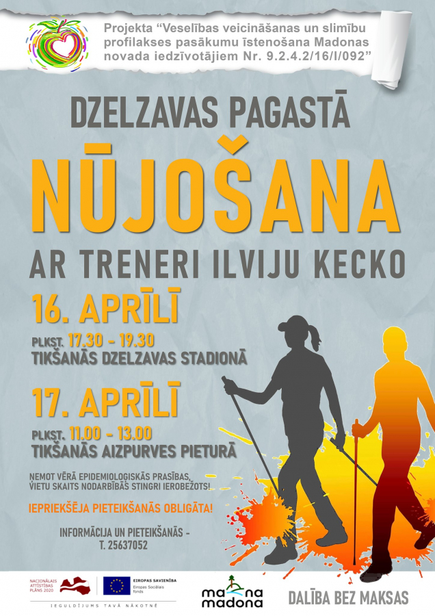 Projekta “Veselības veicināšanas un slimību profilakses pasākumu īstenošana Madonas novada iedzīvotājiem Nr. 9.2.4.2/16/I/092” ietvaros sākas veselību veicinošas nūjošanas nodarbības Dzelzavas pagasta ļaudīm.
