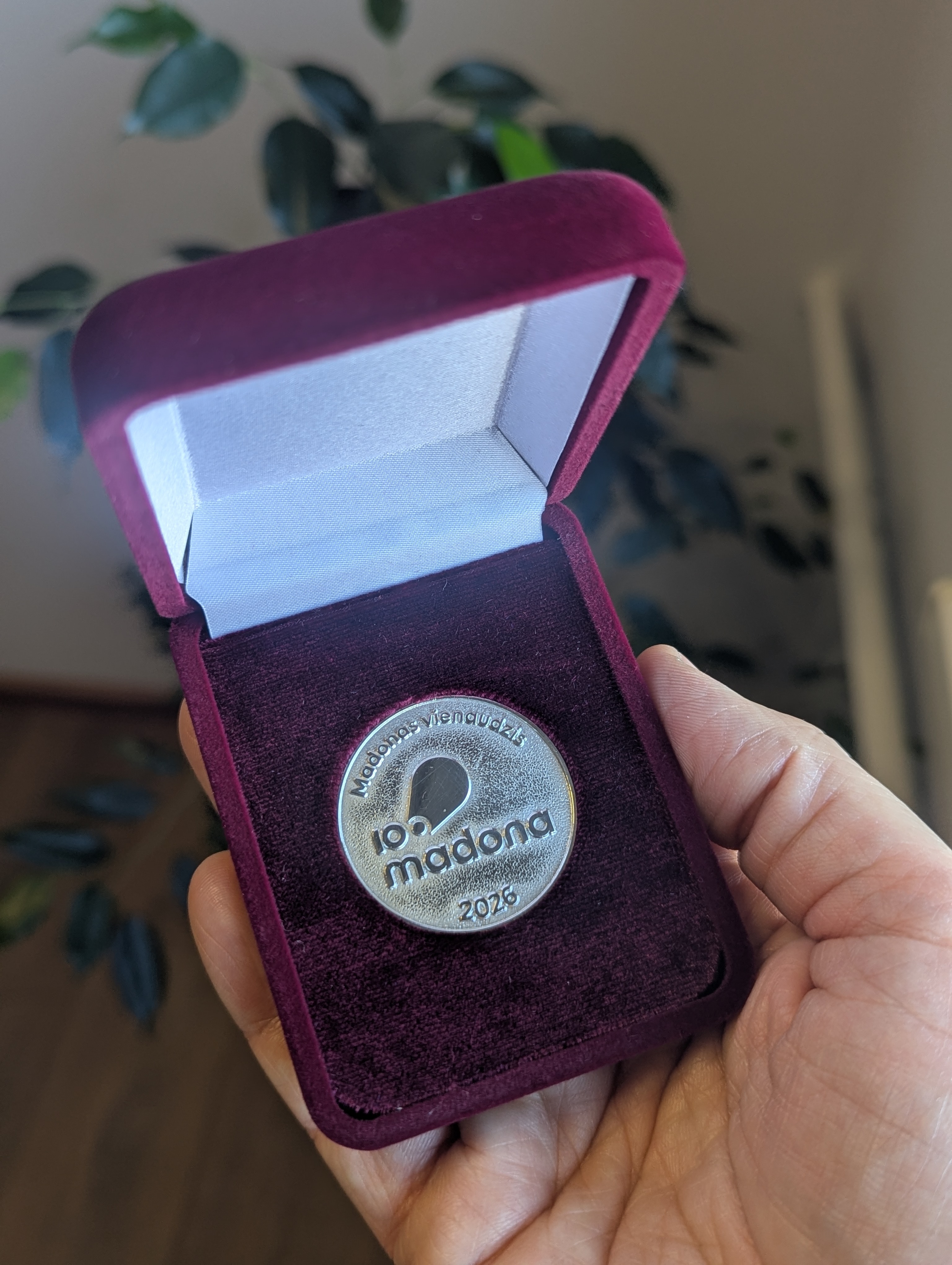 Jubilāre saņēma ziedus, apsveikumu un sudraba Madonas pilsētas simtgades piemiņas monētu "Madonas vienaudzis".