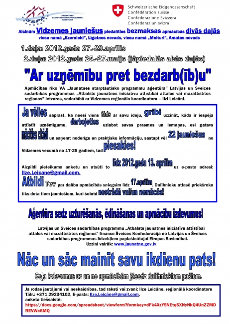 Latvijas – Šveices sadarbības programmu „Atbalsts jaunatnes iniciatīvu attīstībai attālos vai mazattīstītos reģionos” finansē Šveices Konfederācija no Latvijas un Šveices sadarbības programmas līdzekļiem paplašinātajai Eiropas Savienībai.