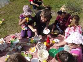 „Esam gājuši pārgājienā, apguvuši ēst gatavošanas prasmi „Pankūku ballītē”, degustējuši jauno medu atsaucīgā un zinošā bitenieka Jāņa Puriņa veikalā „Strops” Saieta laukumā, pārbaudījuši savu veiklību un spēkus sporta dienā un apguvuši dažnedažādas rokdarbu tehnikas. Taču viena no spilgtākajām „Štābiņa” aktivitātēm bija pārgājiens ar dabas stūrīša sakopšanu. Izvēloties Karjera ezera apkārtni pat nenojautām, cik liels darbs mūs sagaida - pudeļu kaudzes, apģērbu gabali, papīru gumzas, saulespuķu, pudeļu korķu un izsmēķu čupas. To visu vākt un tīrīt nemaz nebija tik patīkami, taču pēc paveiktā darba bija patiešām gandarījuma sajūta”, piedzīvotajā dalās projekta dalībniece Ramona. Viņa aicina ieskatīties fotogrāfijās un ikreiz, dodoties mājup, atskatīties, kādu vidi mēs atstājam katrs aiz sevis. Ar domu - lai nākamreiz atnākot mums būtu prieks baudīt ūdens veldzi un dabas tuvumu, nevis nepatikā jāsarauc deguns un jāmeklē daudz maz tīra vieta, kur apsēsties.