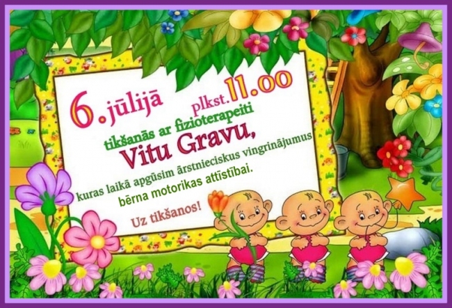 6.jūlijā plkst.11.00 bēbīšu skoliņā "Asniņš" notiks tikšanās ar fizeoterapeiti Vitu Gravu.