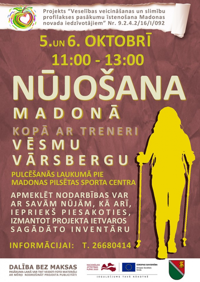 Projekta “Veselības veicināšanas un slimību profilakses pasākumu īstenošana Madonas novada iedzīvotājiem” Nr. 9.2.4.2/16/I/092 ietvaros tiek turpināta uzsāktā aktivitāte - nūjošana. Šoreiz Madonā.