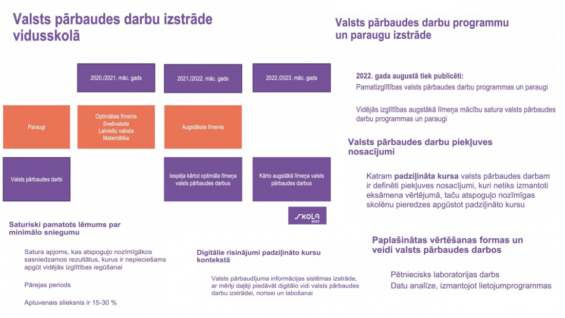 Septembrī mācību resursu krātuvē mape.skola2030.lv publicējām optimālā līmeņa paraugus svešvalodas, matemātikas un latviešu valodas eksāmeniem, kā arī vispārīgā līmeņa eksāmena paraugu matemātikā – matemātikas eksāmenu vispārīgajā līmenī varēs kārtot tikai profesionālās izglītības audzēkņi. Tāpat publicēsim programmu, kurā aprakstīti principi, vadlīnijas, uz kurām būvēts konkrētais paraugs. Nākamā gada augustā publicēsim visu padziļināto kursu eksāmenu paraugus un programmas. Tas nozīmē, ka vienu mācību gadu iepriekš skolotājiem būs zināms, kā tie izskatīsies.