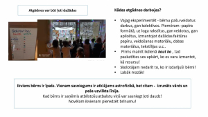 Praktiskie padomi un labās prakses dalīšanās vienam ar otru ir visnotaļ svarīga mācību procesa īstenošanas iespēja, lai dažādotu mācību nodarbības. Seminārā pedagogi ir dalījušies ar dažādu atgādņu izveidi un izmantošanu mācību darbā pirmsskolas mācību jomās. (skat. attēlu galerijā) Atgādnes ir bērnu darbi, kas palīdz apgūt noteiktu tēmu. Skolotājam nedarīt to, ko var izdarīt bērni! Vajag eksperimentēt! Pirms ikdienā kaut ko mainīt, vajag paskatīties visapkārt, ko es varu izmantot kā resursu.