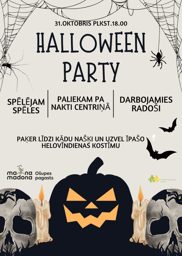 31.10.2025 plkst. 18.00 Helovīna vakarā aicinām bērnus un jauniešus uz ballīti Ošupes pagasta multifunkcionālajā centrā "13.km"