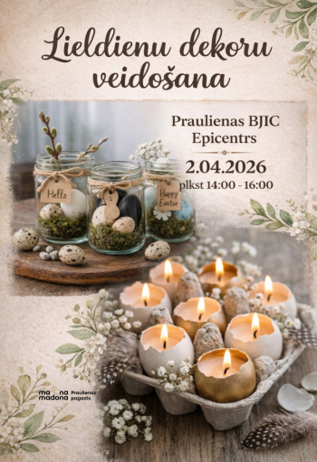 Praulienas pagasta bērnu un jauniešu iniciatīvu centrs "Epicentrs " 02.04.2026. no plkst. 14:00 – 16:00 aicina uz Lieldienu dekoru veidošanu.