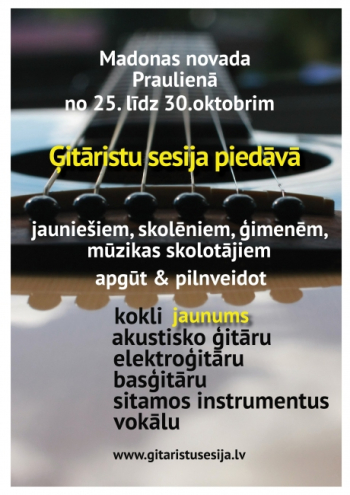 Jau 19 gadus tiek kopta tradīcija vienkopus sanākt daudziem desmitiem elektrisko un akustisko ģitāristu spēlmaņiem, basģitāristiem, koklētājiem, rokgrupām, vokālistiem un ikvienam interesentam, kurš vēlas mācīties un izzināt ko vairāk par mūziku! Tā ir mūzikas simbioze, kvalifikācijas celšanas kursi mūzikas skolotājiem, tā ir "Ģitāristu sesija 2015"! 25.-30.oktobris, Madonas novadā, Praulienas skolā