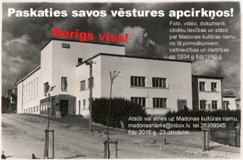Aicinām jūs piedalīties papildus materiālu vākšanā, pārskatīt savu vecāku un vecvecāku albūmus un padalīties ar fotogrāfijām, dokumentiem vai video kadriem par Madonas kultūras namu un dzīvi tajā no tā pirmsākumiem līdz 1990.gadam. Lūdzam atsaukties cilvēkus, kas pazīst vai zina stāstus par cilvēkiem, kas ar to bijuši saistīti, piedalījušies kultūras nama ēkas jeb kādreizējā aizsargu nama veidošanā un celtniecībā, varbūt ziedojuši naudu vai celtniecības materiālus. Varbūt jums ir kādas norādes, kur var atrast šādus materiālus. Informāciju lūdzam atnest vai atsūtīt uz Madonas pilsētas kultūras namu līdz 23.oktobrim Inārai Cakulei, tel. 26339045., madonasnams@inbox.lv. 14.novembrī aicinām uz Madonas pilsētas kultūras nama 80 gadu jubilejas koncertu - aicināti visi madonieši!