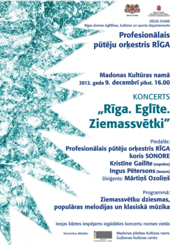 Ziemassvētku koncertu 9. decembrī Madonas Kultūras namā sniegs Profesionālais pūtēju orķestris „Rīga” diriģenta Mārtiņa Ozoliņa vadībā. Piedalīsies solisti Kristīne Gailīte, Ingus Pētersons un koris „Sonore”.iesūtīts: 04.12.2012lasīt tālāk