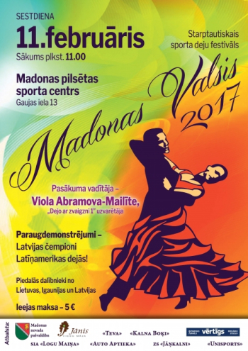 Brīnišķīga iespēja baudīt sporta deju neatkārtojamo gaisotni Madonā! Pirmo reizi arī sporta centra zālē! Dalībnieki no Lietuvas, Igaunijas un Latvijas. Paraugdemonstrējumi - Latvijas čempioni Latīņamerikas dejās! Pasākuma vadītāja - apburošā Viola Abramova - Mailīte...