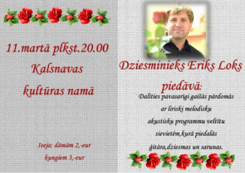 Ēriks Loks piedāvā dalīties pavasarīgi gaišās pārdomās ar liriski melodisku akustisku programmu veltītu sievietēm, kurā piedalās ģitāra, dziesmas un sarunas.