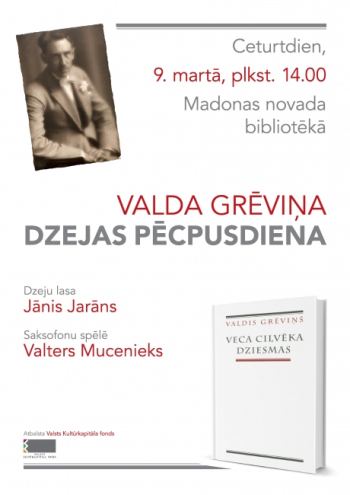 Ceturtdien, 9.martā, Madonas novada bibliotēkā notiks dzejnieka Valda Grēviņa dzejai veltīts sarīkojums. Dzeju tajā runās aktieris Jānis Jarāns, lasījumu muzikālās skaņās ietērps saksofonists Valters Mucenieks.