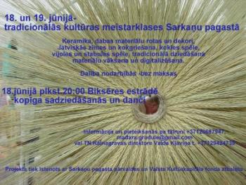 Ieskandinot gada latviskākos svētkus Jāņus, Sarkaņu pagastā notiks tradicionālās mākslas meistarklases, kuras vadīs profesionāli pasniedzēji. Interesentiem būs iespēja iegūt zināšanas un prasmes keramikā, dabas materiālu rotu un dekoru izgatavošanā, iepazīt latviskās zīmes un izzināt kokgriešanas noslēpumus, iegūt pamatprasmes kokles, vijoles un stabules spēlē, tradicionālajā dziedāšanā, kā arī materiālu vākšanā un digitalizēšanā...