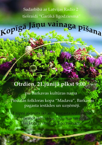 Otrdien, 21.jūnijā, pie Barkavas kultūras nama sadarbībā ar Latvijas Radio 2 rīkoto tiešraidi „Garākā līgodziesma” KOPĪGĀ JĀŅU VAINAGA PĪŠANA piedaloties folkloras kopai „Madava”, Barkavas pagasta iestādēm un uzņēmējiem. Laipni aicināts ikviens pagasta iedzīvotājs, līdzi ņemot jāņuzāles, zaļumus un puķes, lai kopīgi veidotu līgo vainagu!