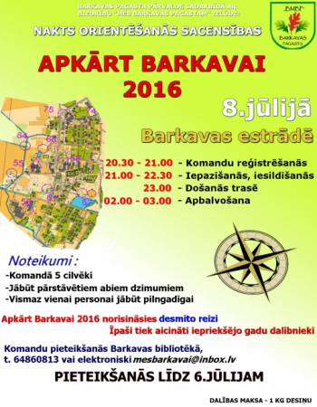 Barkavas pagasta pārvalde sadarbībā ar biedrību „Mēs - Barkavas pagastam” aicina piedalīties 10. Nakts orientēšanās sacensībās „Apkārt Barkavai 2016”. Noteikumi: komandā 5 cilvēki, jābūt pārstāvētiem abiem dzimumiem, vismaz viena persona pilngadīga. Īpaši aicinātas komandas, kas jau ir piedalījušās šajās sacensībās...