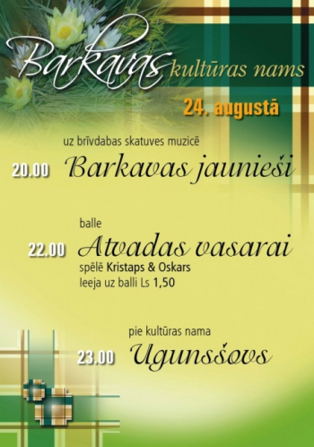 Tradicionāli katru gadu vasaras mēnešos Barkavā notiek brīvdabas skatuves pasākumi. Šovasar uz skatuvītes tika rādīta Baltinavas teātra izrāde „Ontans i Anne”, Krustpils dramatiskā kolektīva komēdija „Visi radi kopā”.Barkavas mazie dejotāji un dziedātāji priecēja ar skaistu koncertiņu „Vasaras ballīte”, notika ari lielie Starptautiskā folkloras festivāla „Baltica 2012” Novada dienu svētki un XII Tautas muzikantu svētki. Nu laiks pēdējai šīs vasaras skatuvei 24.augustā plkst 20.00 muzicē Barkavas jaunieši ar dziesmām, dejām un dažādu instrumentu spēli. Koncertu vadīs barkaviete Zane Radžēle,kura pati priecēs skatītājus ar savu balsi un ģitāras spēli. Pasākumu apskaņo Barkavas kultūras nama vokāli instrumentālās studijas vadītājs Kristaps Vēvers, kurš arī pats piedalās koncertā un plkst.22.00 spēlē balli ‘Atvadas vasarai” kultūras namā. Neliels pārsteigums vasaras brīvdabas skatuvītes skatītājiem būs ugunsšovs, kurš norisināsies pie kultūras nama ēkas plkst. 23.00 . VISI MĪĻI GAIDĪTI!