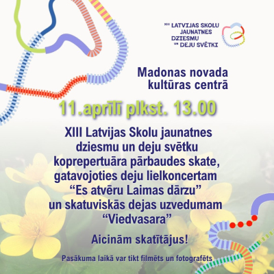 11. aprīlī plkst. 13.00 - skolēnu tautas deju kolektīvu koprepertuāra apguves skate, gatavojoties XIII Latvijas Skolu jaunatnes dziesmu un deju svētku deju lielkoncertam “Es atvēru Laimas dārzu” un skatuviskās dejas uzvedumam “Viedvasara”.