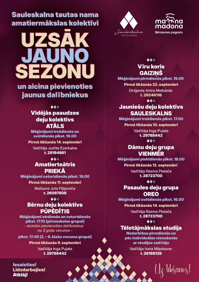 Uzsākot jauno 2025. / 2026. gada sezonu, Sauleskalna tautas nama amatiermākslas kolektīvi aicina pievienoties savam pulkam.
