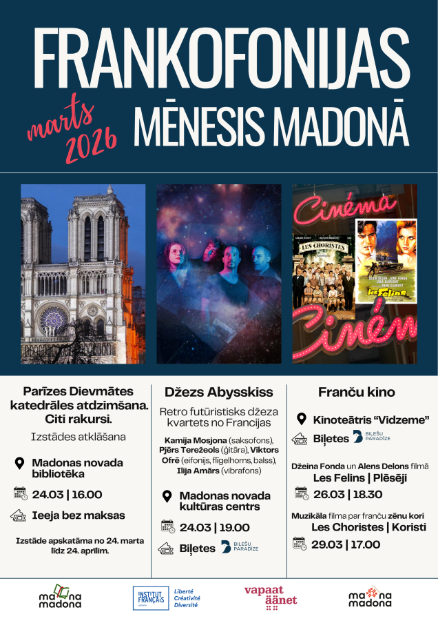 Martu varam dēvēt par Frankofonijas mēnesi. Rīgā, Jelgavā, Daugavpilī, Jūrmalā, Liepājā un arī Madonā Frankofonija aizkustinās ikvienu interesentu – kino, izstādes, literatūra, lekcijas, koncerti, ko piedāvās vairāk nekā 11 valstis.
