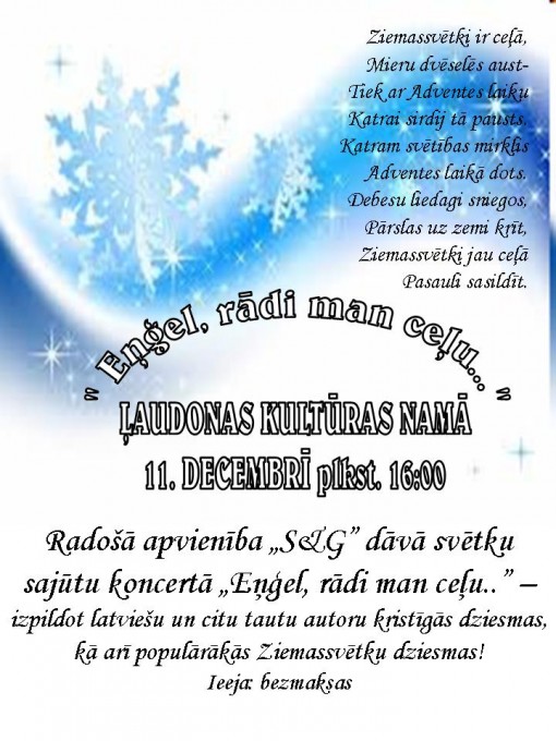 Jau tradicionāli Ļaudonas pagasta pārvalde saviem iedzīvotājiem dāvina Ziemassvētku ieskaņas koncertu - šoreiz gaišajā svētku laikā ievedīs Radošā apvienība "S&G" ar koncertu "Eņģel, rādi man ceļu..."