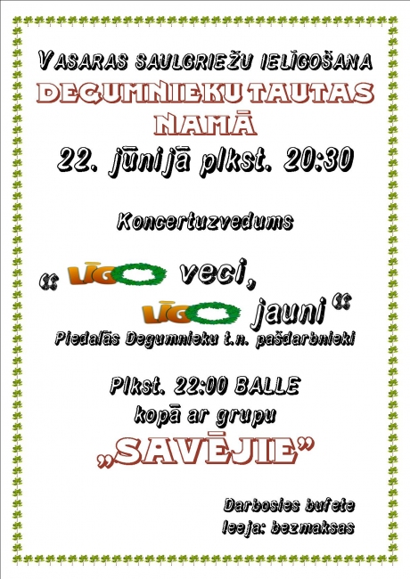 22.jūnijā plkst.20:30 Degumnieku tautas namā Jāņu ielīgošanas pasākums Dziedās, dejos un teātri spēlēs tautas nama pašdarbnieki Plkst.22:00 BALLE kopā ar grupu " Savējie "