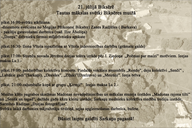 Darbosies paklāju gatavošanas darbnīca, kur tās vadītāja Ilze Āboliņa interesentiem ierādīs kā no veciem T krekliem pagatavot jaunu un noderīgu lietu savam mājoklim. Žannas Pērkones vadībā jebkurš varēs izdaiļot savu seju ar gaumīgu gleznojumu. Darbosies mājražotāju tirdziņš un bufete.