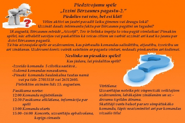 18.augustā plkst.12.00 Bērzaunes estrādē „Aizvējš” Komandu piedzīvojumu spēle „Izzini Bērzaunes pagastu-2” Komandām lūdzam pieteikties Sauleskalna TN līdz 15.augustam, tālr.27015118;26312605