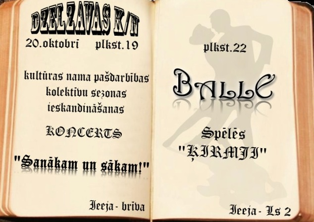 20. OKTOBRĪ visi aicināti uz Dzelzavas kultūras namu, kur plkst.19 koncertā "Sanākam un sākam!" sezonu ieskandinās jauniešu deju kolektīvs "Zīļuki", senioru deju grupa "Dzeldes", vokālais ansamblis "Variants" un līnijdeju grupa "Silver Step". Plkst.22 sāksies BALLE kopā ar grupu "ĶIRMJI".