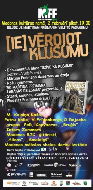 „Liela un pompoza lielkoncerta vietā šogad esam iecerējuši doties ceļojumā pa Latviju, kur koncertu apmeklētāji tiks aicināti gan kopīgi ar Mārtiņa draugiem vienoties dziesmās, gan ieklausīties viņa rakstītajās dzejas rindās”, atcerēties ar Mārtiņu kopā piedzīvotus notikumus un vienkārši pabūt kopā”, stāsta Mārtiņa Freimaņa fonda dibinātāja Maija Kalniņa. Dažādu pasākumu sērija notiks desmit dienas - no 27.janvāra, dienas, kad Mārtiņu zaudējām līdz viņa dzimšanas dienai - 7.februārim.