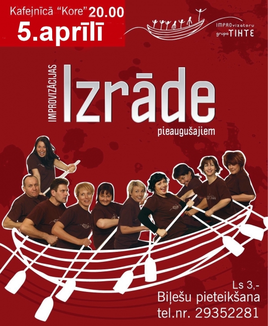 Atkal tuvojas improvizatoru grupas "Tinte"izrāde. Būsi mīļi gaidīts 5.aprīlī kafejnīcā "Kore"". Vari pieteikt biļetes pa tālruni, kurš norādīts uz afišas.