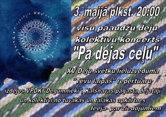 3.maijā plkst. 20:00 Degumnieku TN visu paaudžu deju kolektīvu koncerts " Pa dejas ceļu ". XV Deju svētku lieluzveduma " Tēvu laipas " repertuāru izdejos VPDK " Degumnieki ", Kalsnavas pag.KN jauniešu deju kolektīvs un senioru deju kolektīvs " Jāņukalns", Sarkaņu pagasta VPDK " Labākie gadi "