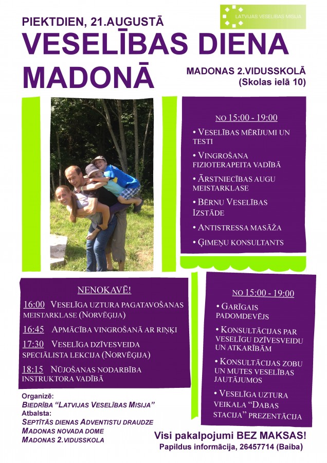 Madonas 2.vidusskolā 21.augustā no pulksten 15.00 līdz 19.00.Visi pakalpojumi bez maksas.Papildus informācija: 26457714 (Baiba).Organizē: Biedrība “Latvijas Veselības Misija”.Atbalsta: Septītās dienas Adventistu draudze, Madonas novada dome, Madonas 2. vidusskola.