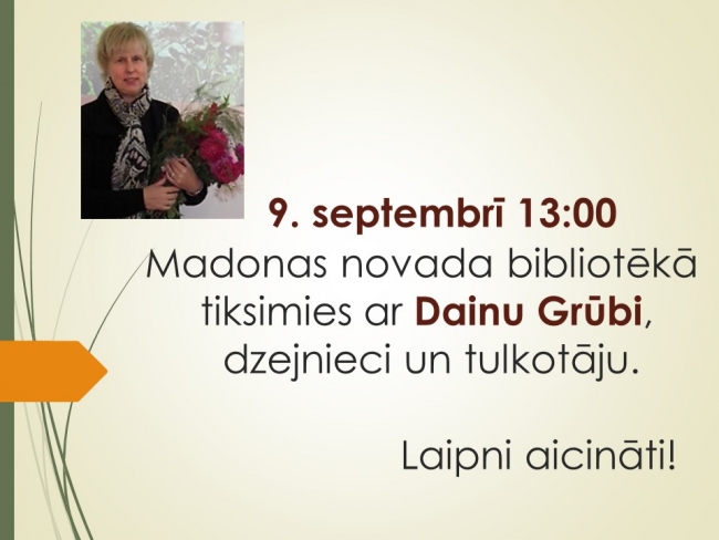 Septembris ir ne tikai Dzejas dienu, Zinību, bet arī Eiropas Valodu dienas mēnesis, tādēļ šogad aicinām uz tikšanos ar dzejnieci, tulkotāju, redaktori, novadnieci, šī gada jubilāri Dainu Grūbi, kas nu jau vairāk kā desmit gadus strādā apgādā „Zvaigzne ABC. Tikšanās ir viena no pašvaldību publisko bibliotēku darbinieku pirmā semināra aktivitātēm, bet gaidīsim ikvienu interesentu.