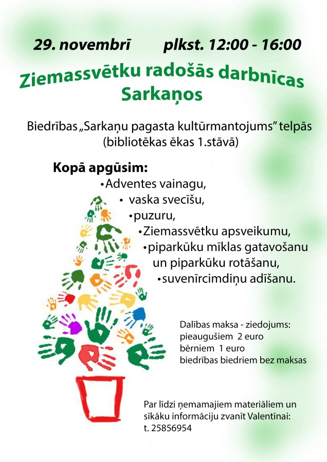 Biedrības “Sarkaņu pagasta kultūrmantojums” pirmajā Adventes svētdienā aicina uz “Ziemassvētku radošo darbnīcu”, kur katrs pēc savām spējām un interesēm varēs piedalīties Adventes vainagu, vaska sveču, puzuru, Ziemassvētku apsveikuma kartīšu gatavošanā, suvenīrcimdiņu adīšanā, piparkūku mīklas gatavošanā un rotāšanā...