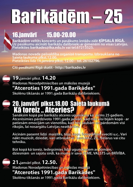 Kā toreiz .. Atceries? 1991.gada janvārī barikādēs visi bijām kopā - ar patiesām emocijām un vienotību, kad bez šaubām un pārdomām visi rīkojās, lai nosargātu Latvijas neatkarību. Sanāksim kopā pie barikāžu atceres ugunskura 20.janvārī pulksten 18.00 Saieta laukumā kā pirms 25 gadiem. Atcerēsimies pārdzīvoto. Aicinām paņemt līdzi maizītes un tēju, segu, lai nav auksti, fotogrāfijas. Iedegsim piemiņas svecītes... Vari nākt dziedāt, muzicēt, vari atbraukt ar savu MAZ, ZIL, Belarus vai citu tehniku. Būt kopā kā toreiz... Iedegsimies līdzi ugunskuriem ar domām, dziesmām un sajūtu sirdī, ka mums ir sava ZEME, VALSTS un BRĪVĪBA.