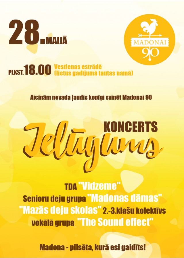 Vestienas estrādē (lietus gadījumā tautas namā) 28.maijā pulksten 18.00. Madona - pilsēta, kurā esi gaidīts!