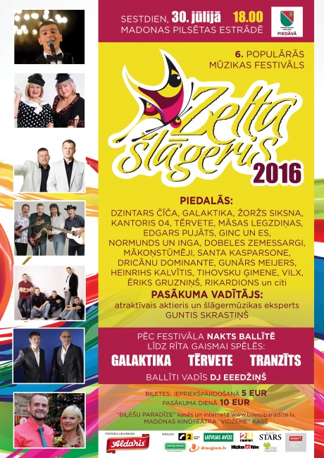 Ar Madonas novada pašvaldības atbalstu, jau sesto reizi Madonas pilsētas estrādē notiks gada nozīmīgākais šlāgerfestivāls Latvijā - „ZELTA ŠLĀGERIS 2016”...30.jūlijā pulksten 18:00 Madonas estrādē, notiks jau sestais populārās mūzikas festivāls „ZELTA ŠLĀGERIS 2016”, kurā uzstāsies populārākās šlāgermūzikas grupas un izpildītāji: Dzintars Čīča, Galaktika, Žoržs Siksna, Kantoris 04, Tērvete, Māsas Legzdiņas, Edgars Pujāts, Ginc un Es, Normunds un Inga, Dobeles Zemessargi, Mākoņstūmēji, Santa Kasparsone, Dricānu Dominante, Gunārs Meijers, Heinrihs Kalvītis, Tihovsku ģimene, Vilx, Ēriks Gruzniņš, Rikardions un citi.