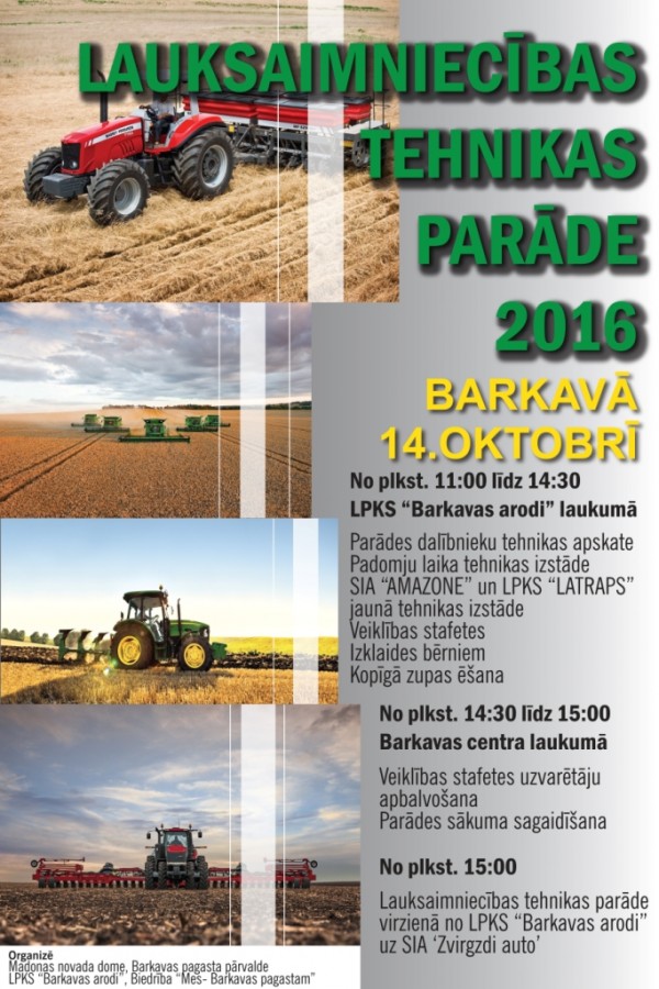 No plkst.15:00 Lauksaimniecības tehnikas parāde virzienā no LPKS „Barkavas arodi” uz SIA „Zvirgzdi auto”.