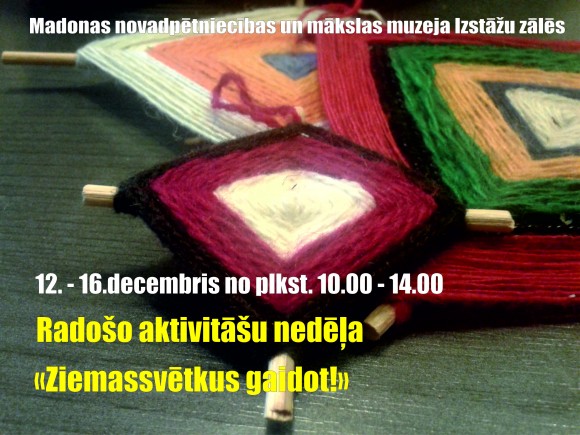 Skolēnu klases aicinām pieteikties, zvanot pa tālruni 64823844 vai 26102225.14.decembrī pulksten 12.00 aicinām uz ikmēneša tikšanos senioriem, ciklā “Dzīves un mākslas krāsās” Ziemassvētku noskaņās. Runāsim par laikrāžiem, jo mazajā zālē atklāsim izstādi “Pulksteņi”. Izstāde iepazīstinās ar muzejā gan no novada, gan tālākām vietām gadu gaitā nonākušajiem dažāda veida pulksteņiem - sienas, rokas, galda, modinātājiem. Kopējo laika ritējuma noskaņu papildina fotoattēli, atklātnes, gleznas un dzejnieku rakstītās rindas. Piedalīsies Madonas Valsts ģimnāzijas audzēkņi, radošā drāmas pulciņa dalībnieki. Radīsim svētku noskaņu ar interesantiem stāstiem, radošu kopā darbošanos un labiem vārdiem.
