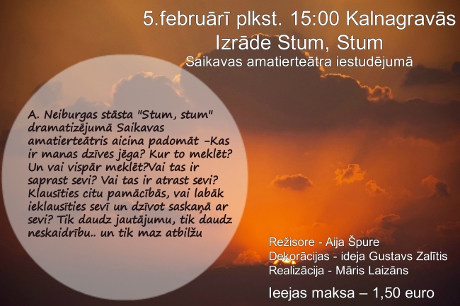 Tautas namā "Kalnagravas" 5.februārī pulksten 15:00.Ieejas maksa: 1.50 EUR.