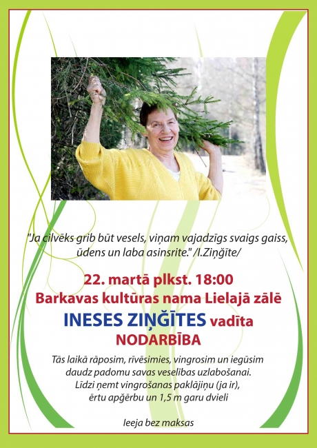 "Ja cilvēks grib būt vesels, viņam vajadzīgs svaigs gaiss, ūdens un laba asinsrite." /I.Ziņğīte/ Ineses Ziņğītes vadītās nodarbības laikā rāposim, rīvēsimies, vingrosim un iegūsim daudz padomu savas veselības uzlabošanai. Līdzi ņemt vingrošanas paklājiņu (ja ir), ērtu apğērbu un 1,5 m garu dvieli.