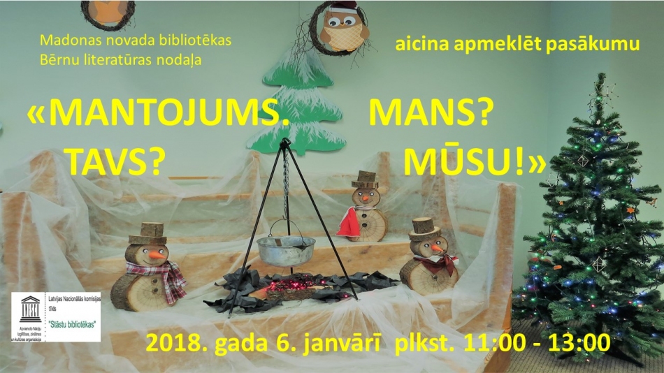 Jauno gadu iesāksim ar UNESCO Latvijas Nacionālās komisijas tīkla "Stāstu bibliotēkas" aktivitāti "Mantojums. Mans? Tavs? Mūsu!". Tas būs īpašs gads visai mūsu valstij un arī Madonas novada bibliotēkai. Mums jau 95! 2017.gadā aicinājām ģimenes dalīties pieredzē par brīvā laika aktivitātēm, bet 2018.gadā godā celsim mantojumu. Mums katram tāds ir! Vai tas būtu sens stāsts, ģimenes leģenda, dziesma vai rotaļa, fotogrāfija, lieta vai amats, ko esam saņēmuši no senčiem. Dalīsimies un kļūsim bagātāki.