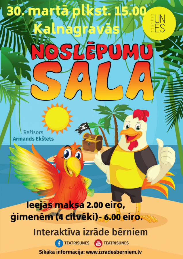 Vai esi gatavs neparastam piedzīvojumam ar dažnedažādiem interesantiem pavērsieniem, aizraujošām darbībām un mīklu minēšanu? Tad šī izrāde ir paredzēta tieši Tev! Noslēpumu sala nav parasta izrāde. Tajā Tu atklāsi dažādus noslēpumus un var gadīties, ka Tu kopā ar izrādes varoņiem nomaldīsies, taču drīz vien sekojot slepenām norādēm nokļūsi uz pareizā ceļa un atradīsi pirātu noslēptos dārgumus!