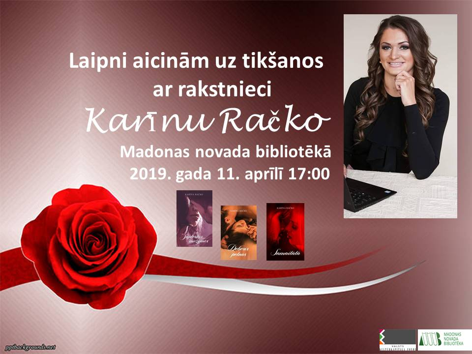 Pirmajā tikšanās reizē 11. aprīlī plkst.17.00 Madonas novada bibliotēkā viesosies Karīna Račko. Autore teic: “Mana Latvijas tūre rit pilnā sparā, un šobrīd teju sāk šķist, ka dzīvoju pie automašīnas stūres, tomēr es ļoti priecājos tikties un iepazīties ar katru lasītāju.”