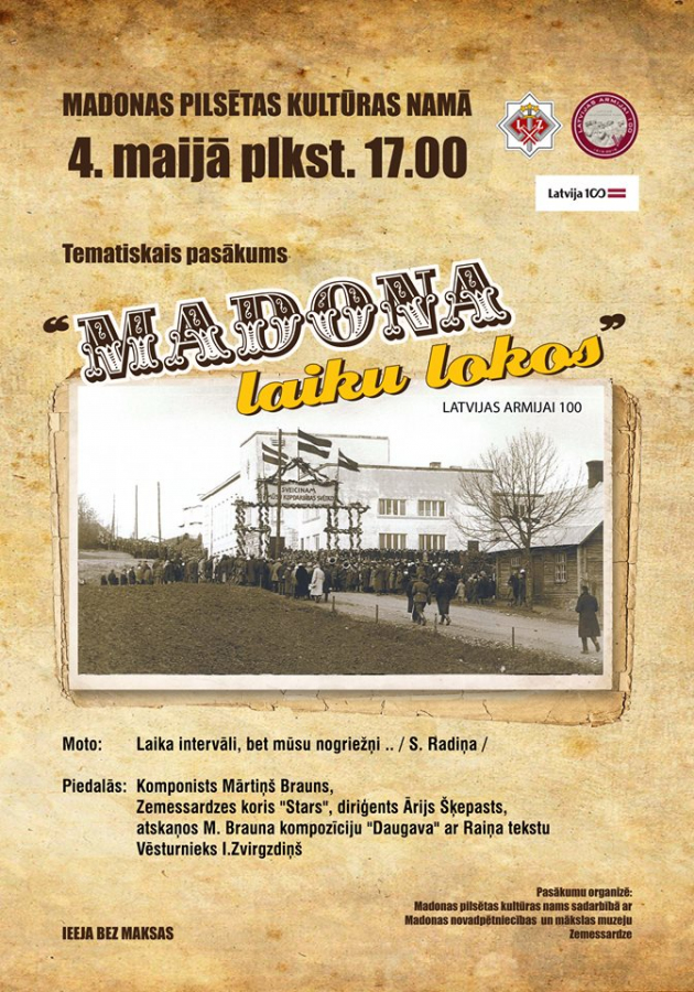 Pasākumu rīko Madonas pilsētas kultūras nams sadarbībā ar Madonas novadpētniecības un mākslas muzeju. Tā norisi atbalsta Zemessardze.