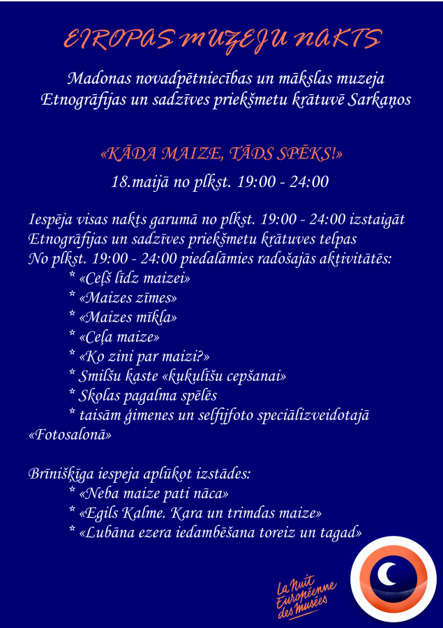 Ar Muzeju nakts programmu aicinām iepazīties zemāk pievienotajos publicitātes attēlos, kā arī Madonas muzeja mājas lapā www.madonasmuzejs.lv un sociālajā tīklā www.facebook.com/muzejsmadona