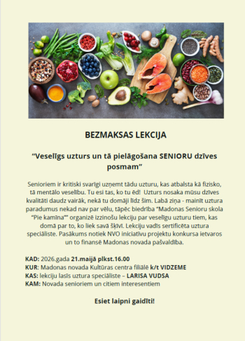 Senioriem ir kritiski svarīgi uzņemt tādu uzturu, kas atbalsta kā fizisko, tā mentālo veselību. Tu esi tas, ko tu ēd! Uzturs nosaka mūsu dzīves kvalitāti daudz vairāk, nekā tu domāji līdz šim. Labā ziņa - mainīt uztura paradumus nekad nav par vēlu, tāpēc biedrība “Madonas Senioru skola “Pie kamīna”” organizē izzinošu lekciju par veselīgu uzturu tiem, kas domā par to, ko liek savā šķīvī. Lekciju vadīs sertificēta uztura speciāliste.