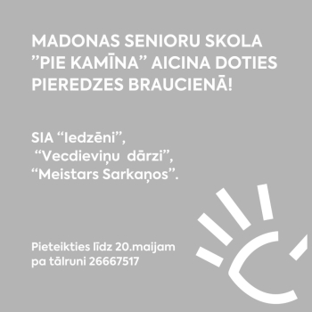 Madonas senioru skola ”Pie kamīna”, īstenojot Madonas novada pašvaldības NVO iniciatīvu projektu ”Dārzs kā spēka avots”, aicina š.g. 28.maijā piedalīties pieredzes braucienā, lai gūtu jaunas praktiskās iemaņas un zināšanas mūsdienīgā dārzkopībā, izaudzētā un dabas dotā izmantošanā.