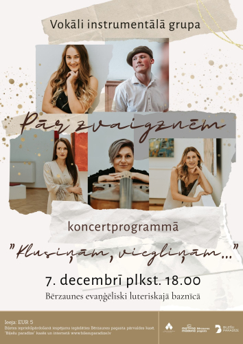 21. decembris 12:30 - 14:00 21. decembrī plkst. 12.30, tūlīt pēc dievkalpojuma, Cesvaines Romas katoļu baznīcā ikviens aicināts uz Ziemassvētku koncertu “Baltā gaidīšana”, kurā izskanēs komponista Valda Zilvera mūzika.